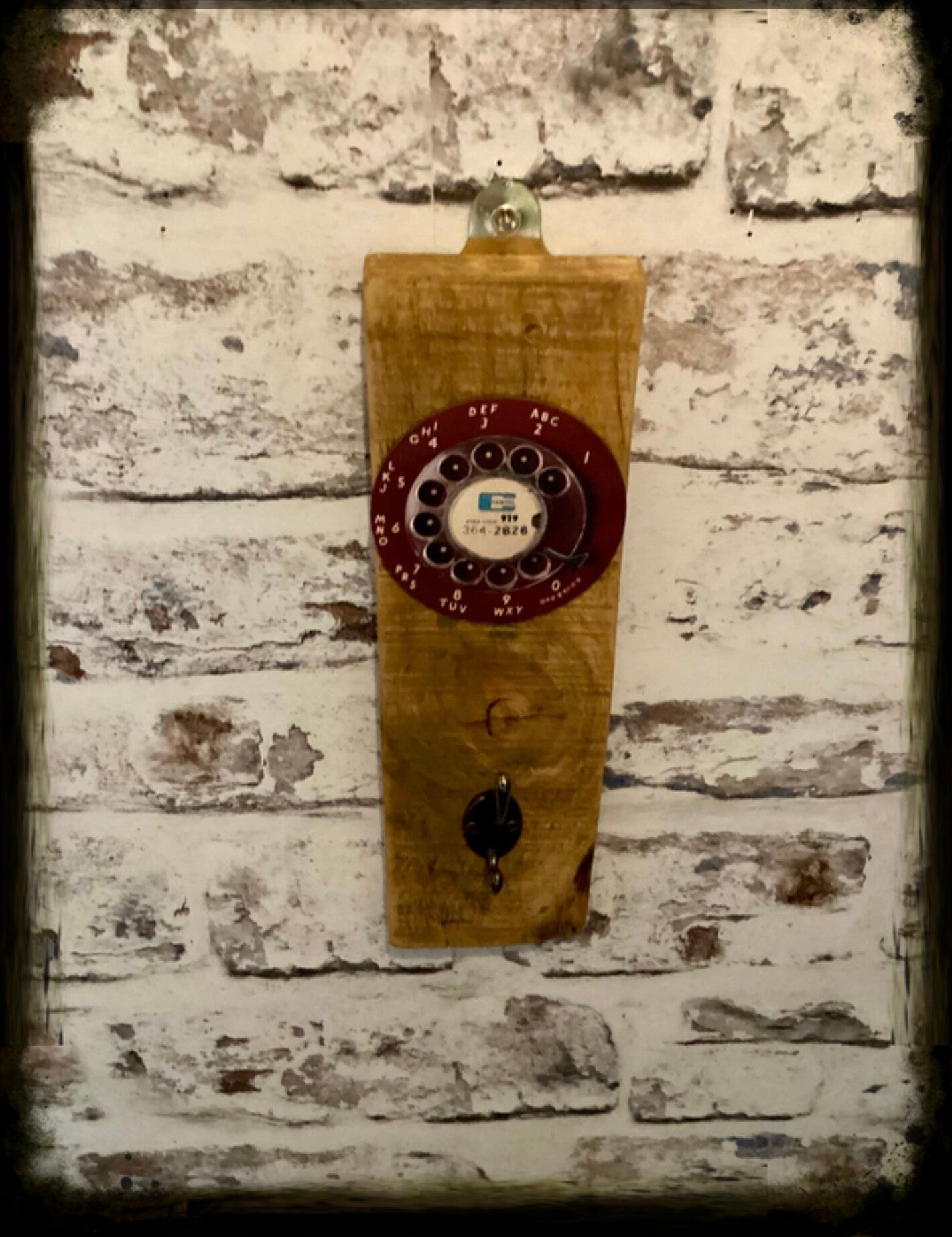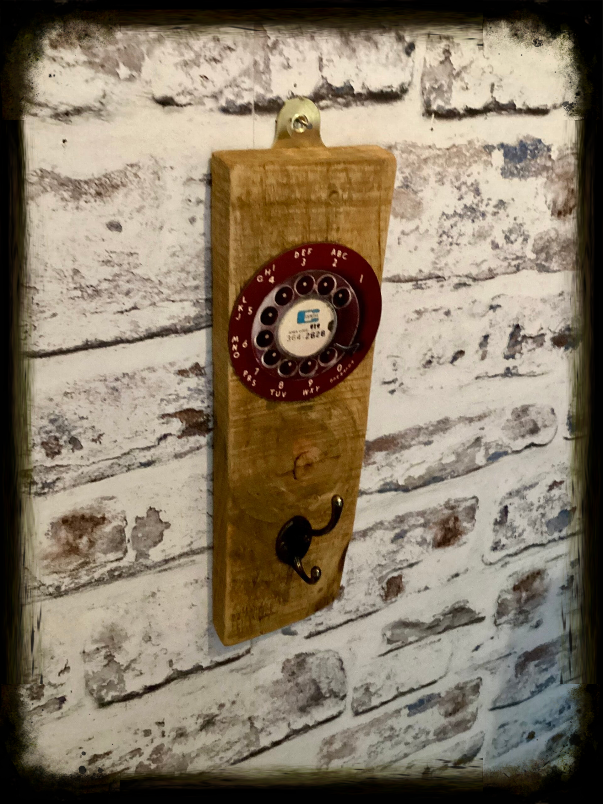 Rustic retro wooden single hook hanger with old school telephone dial deccor