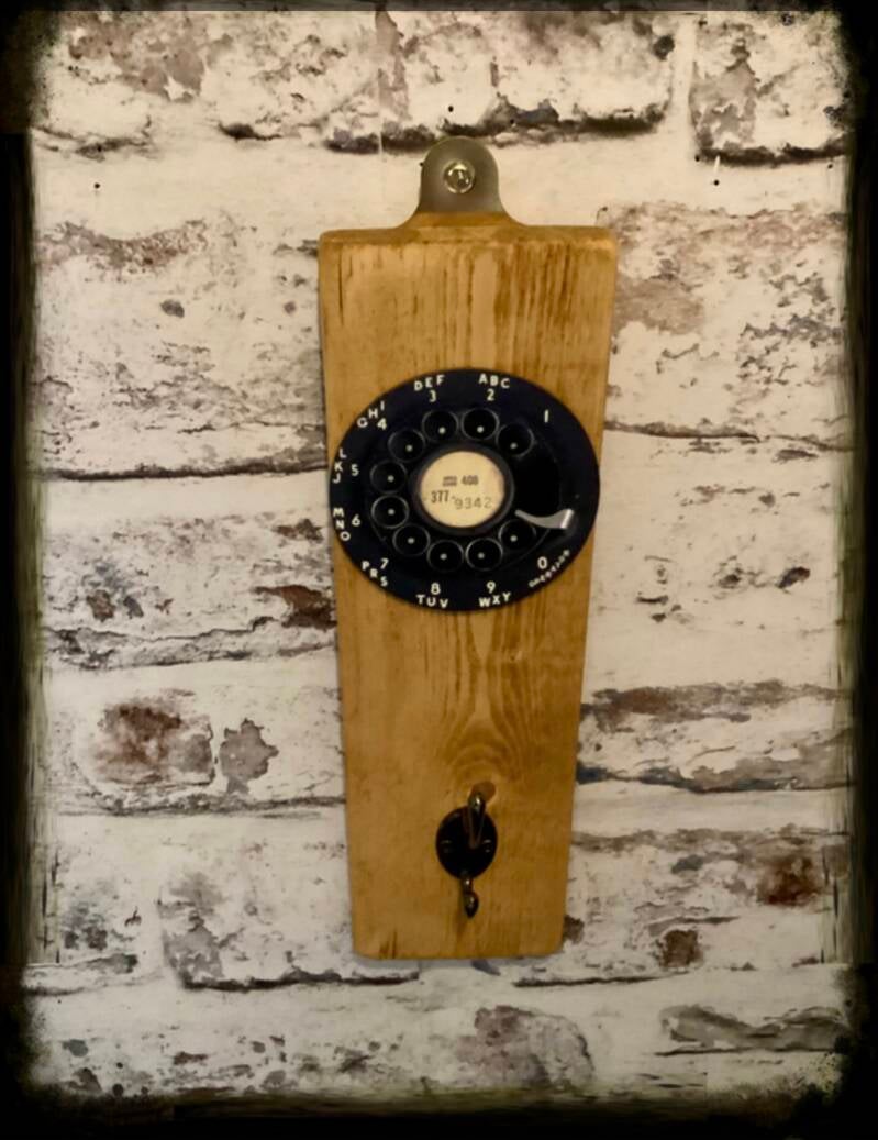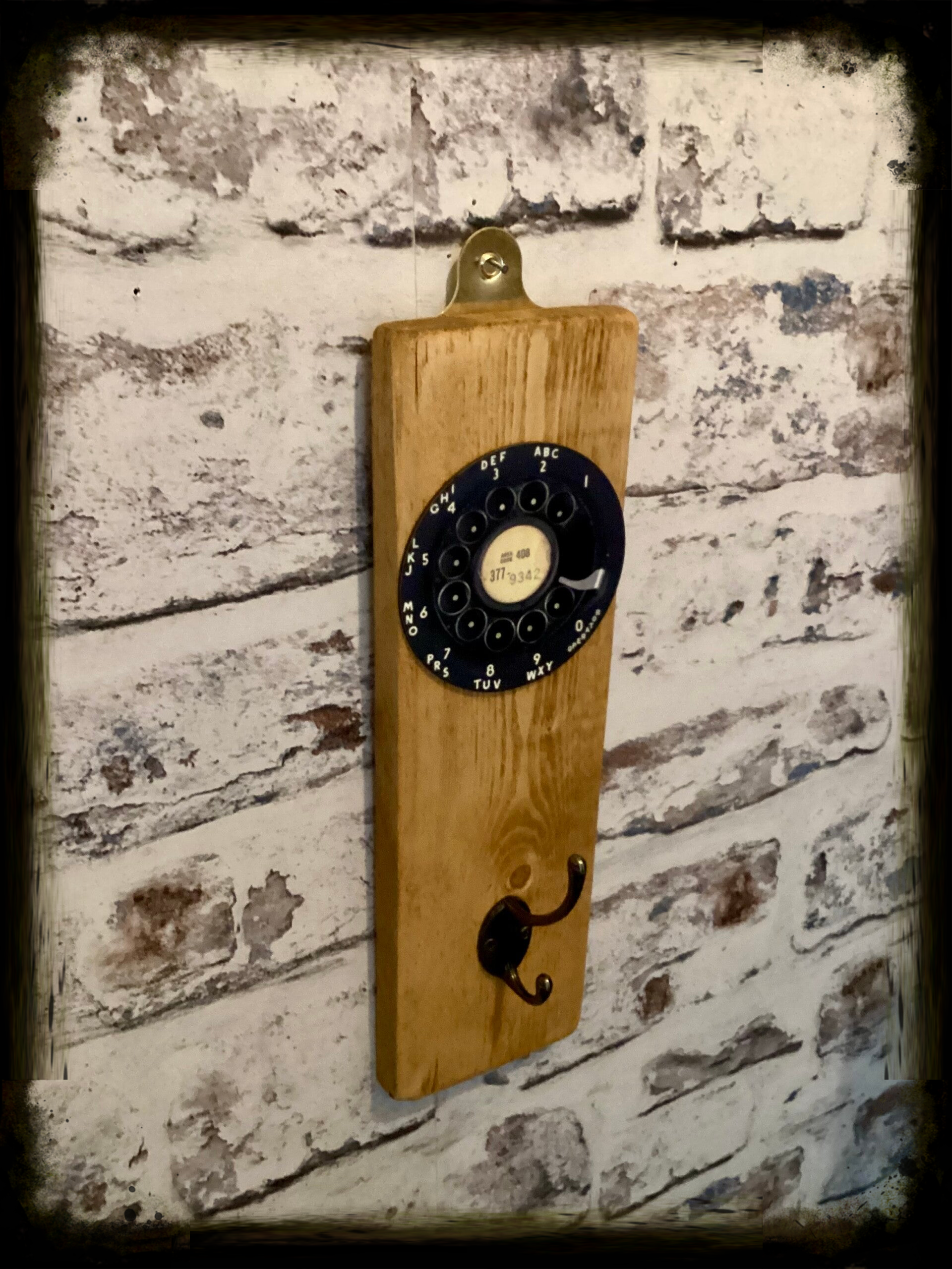 Rustic retro wooden single hook hanger with old school telephone dial decor