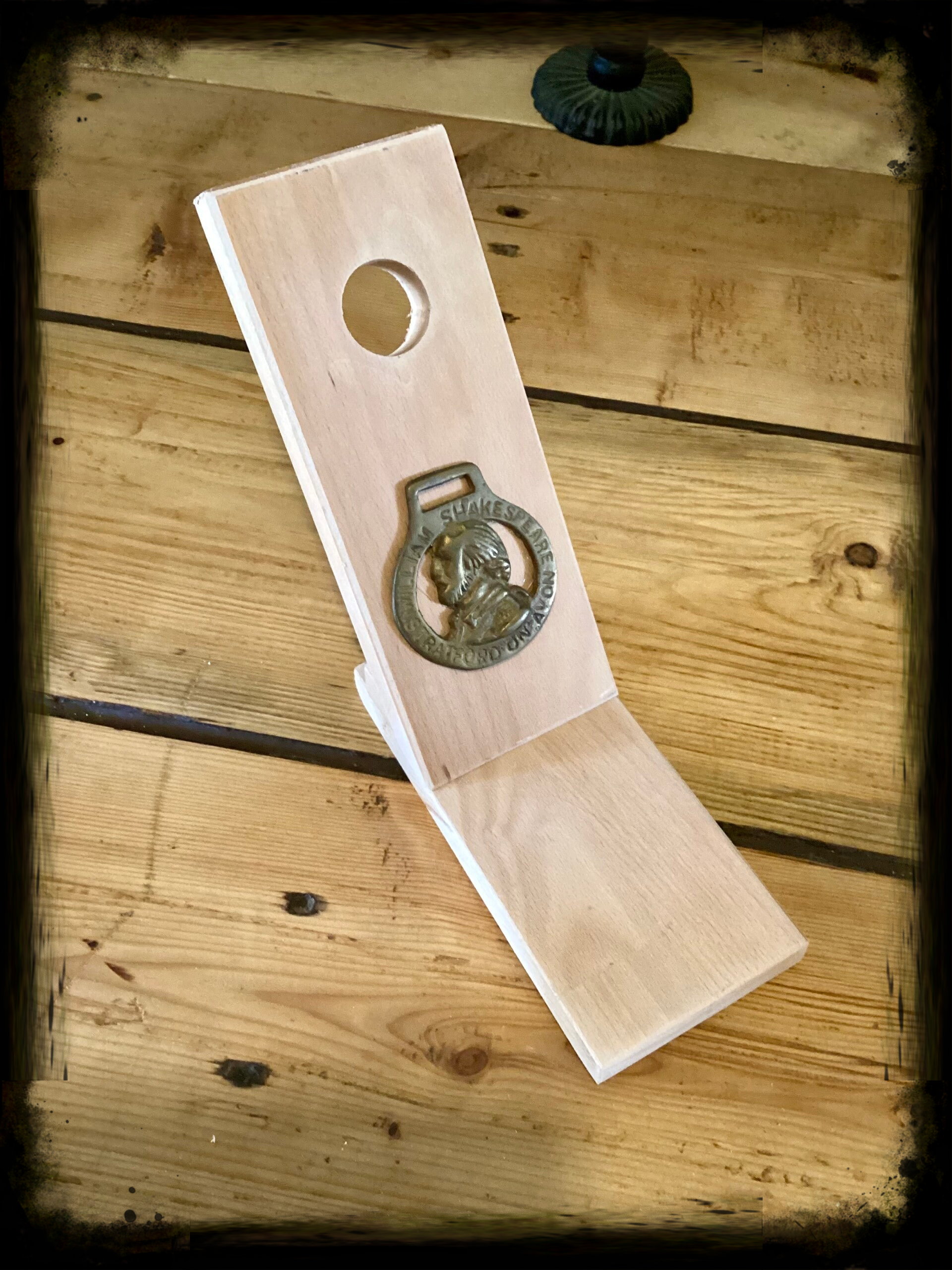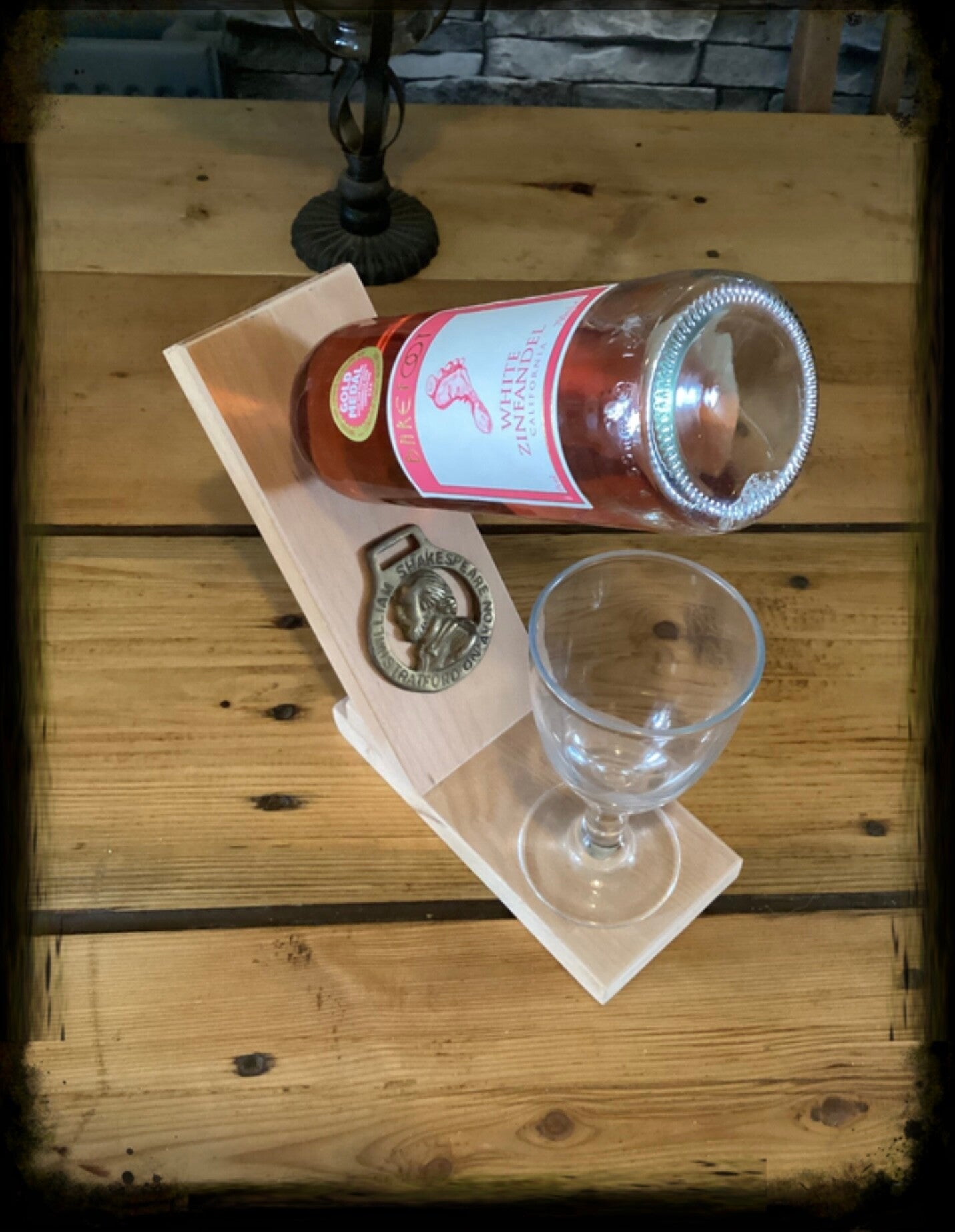 Reclaimed wood bottle holder ( William Shakespeare brass decor).