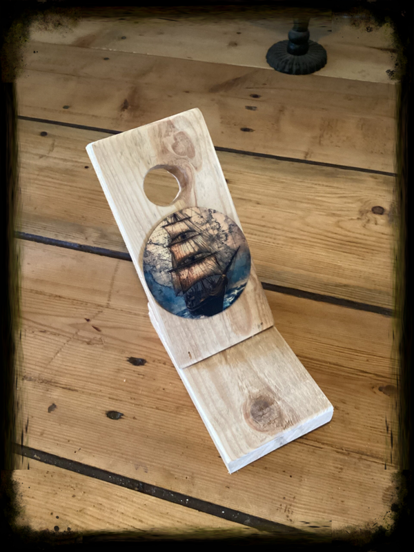 Reclaimed wood bottle holder (old sailing ship decor). Does not come with bottle and glass