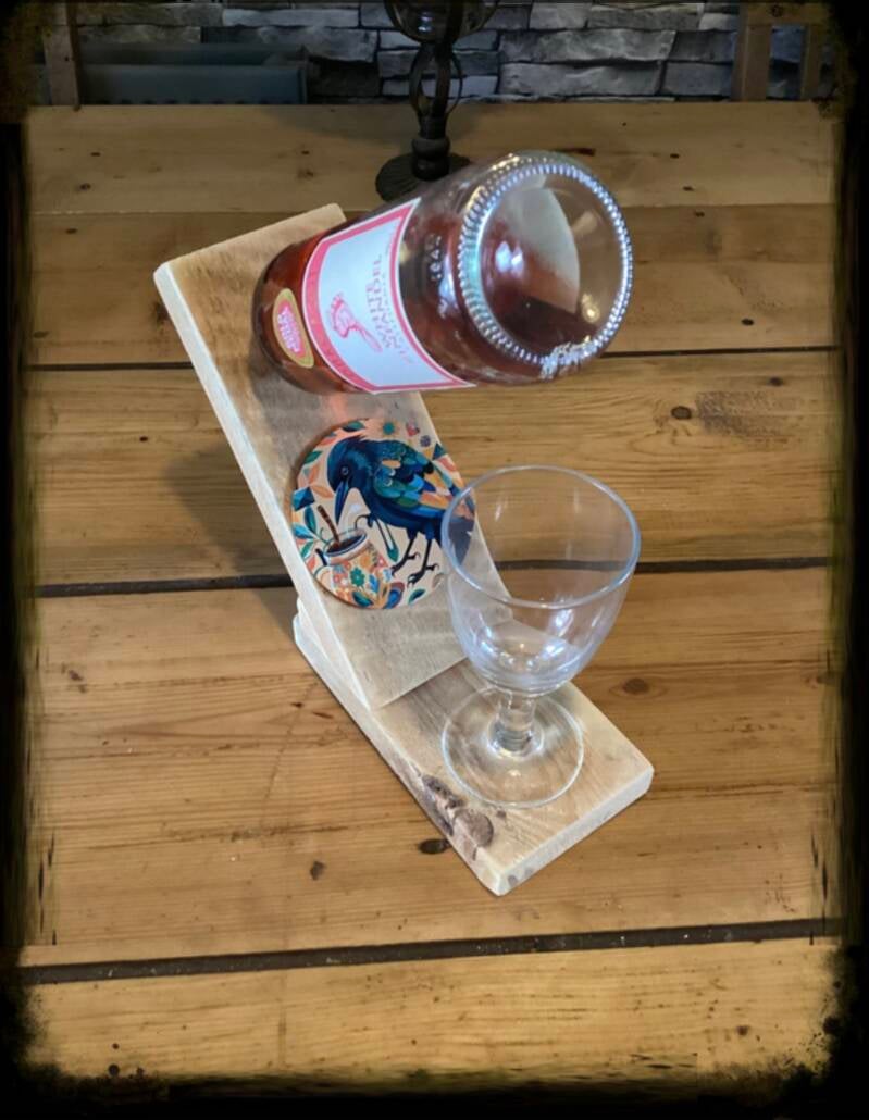 Reclaimed wood bottle holder ( Bohemian bird decor). Does not come with bottle and glass