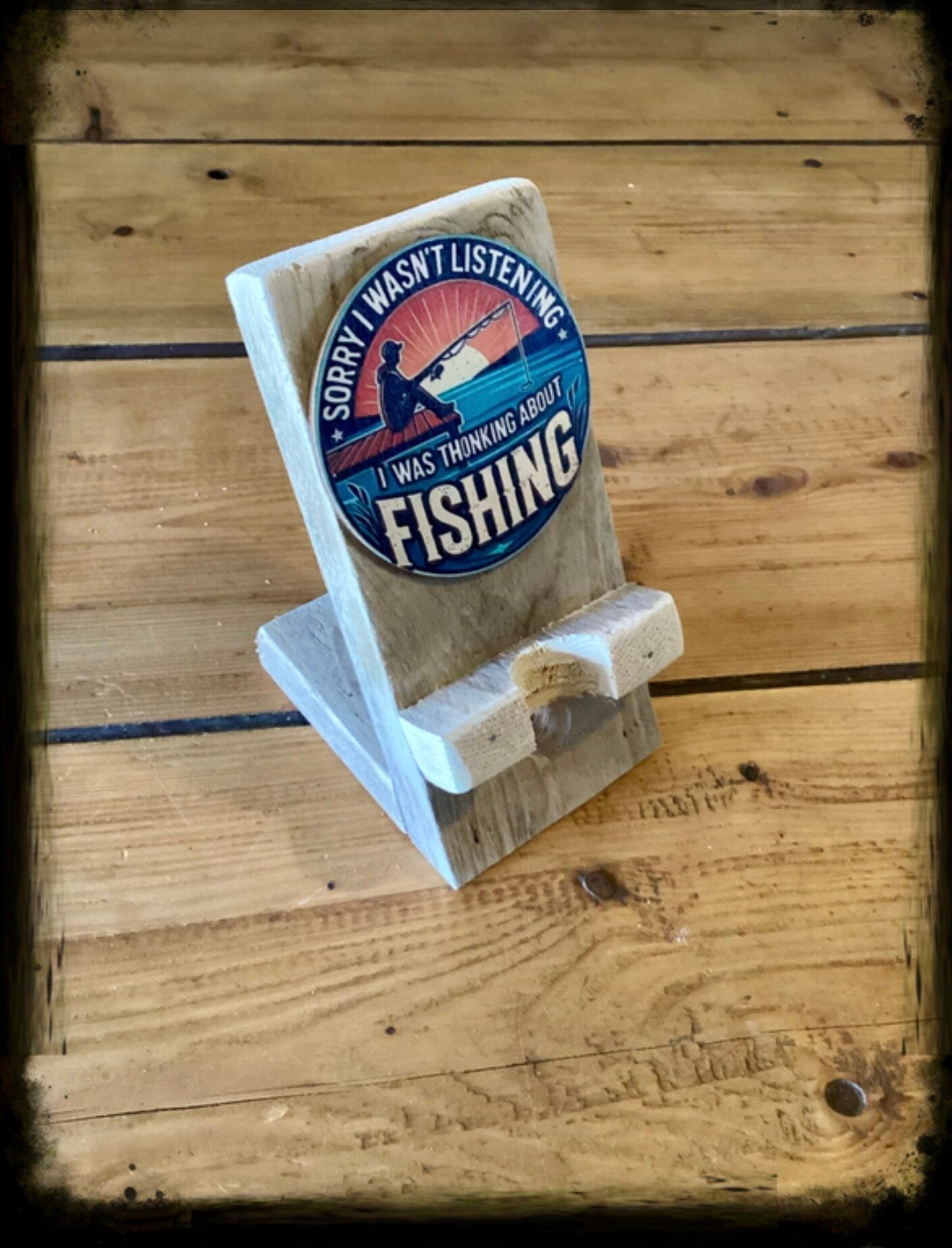 Reclaimed wood rustic mobile phone station with Fishing decor