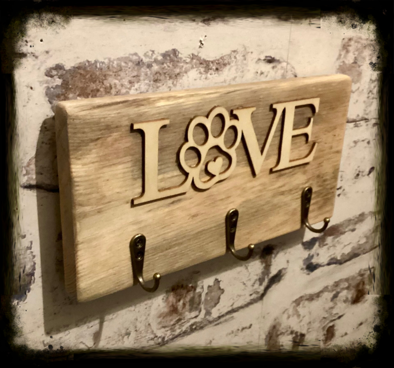 3 Hook Rustic Dog Lead Hanger with love paw print decor