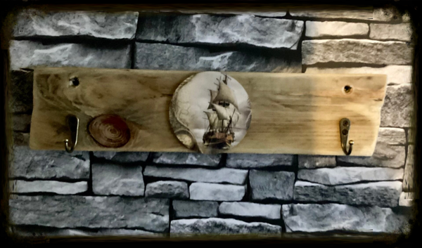 Rustic reclaimed wood 2 hook coat hanger with sail boat decor