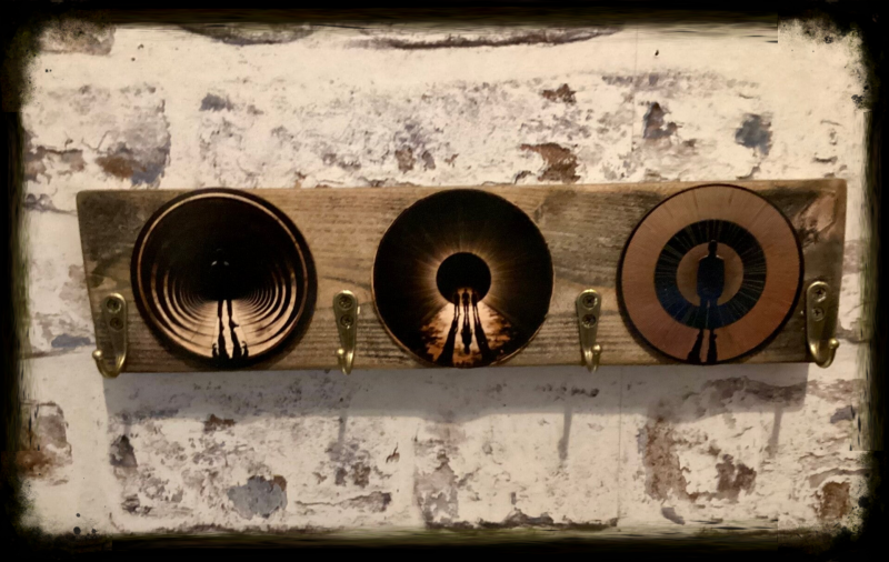 Reclaimed wood 4 hook coat hanger with sci-fi decor