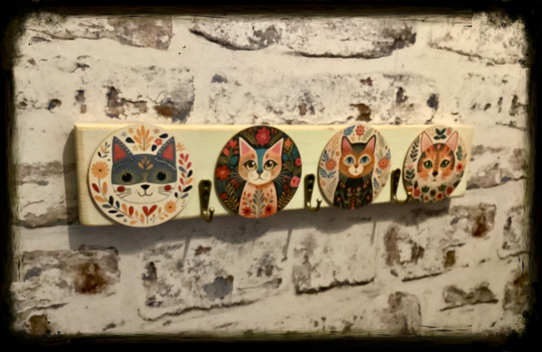 Reclaimed wood rustic 3 hook coat hanger with floral cat decor