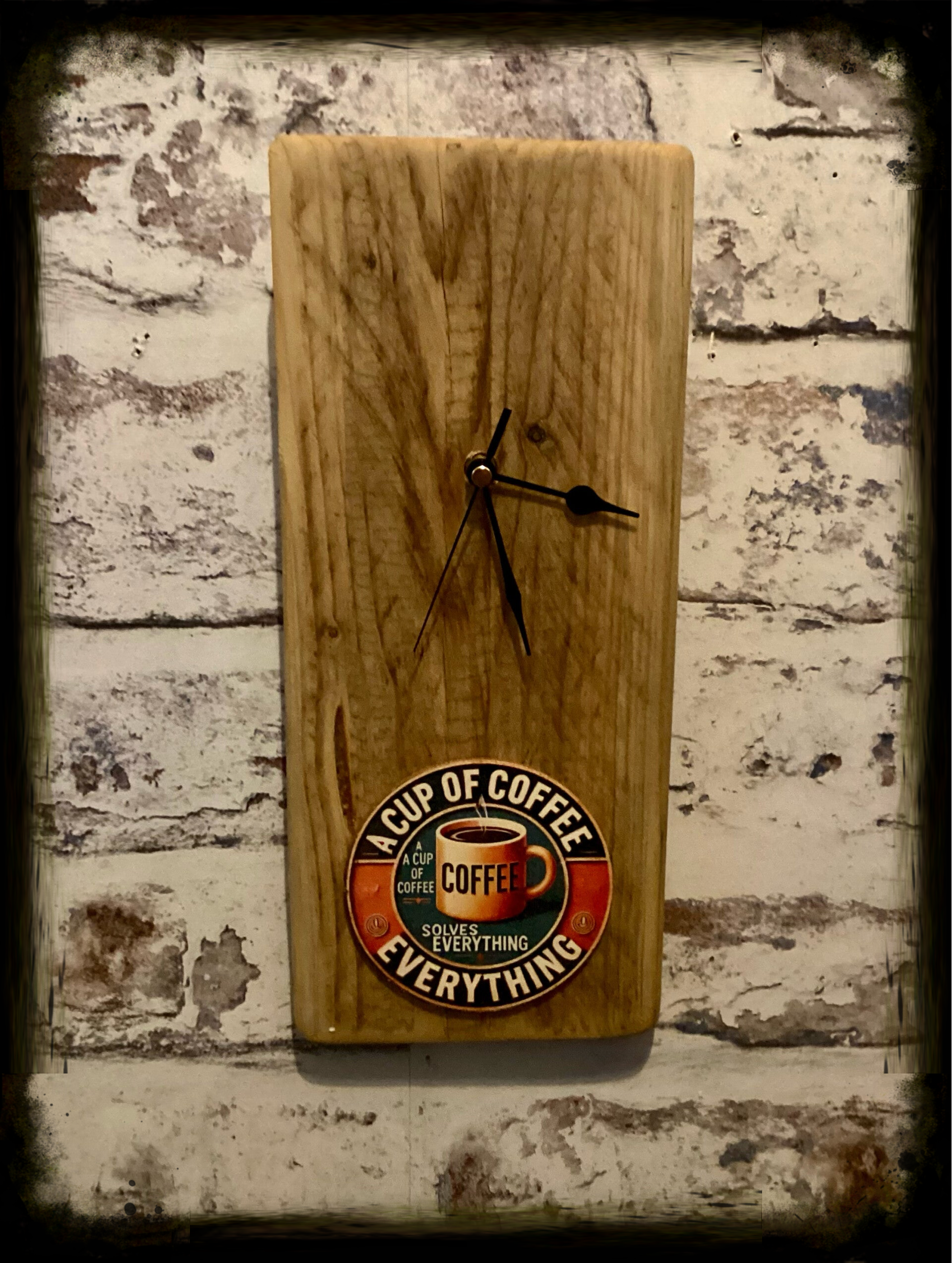 Rustic reclaimed wood wall hanging clock with coffee cup decor